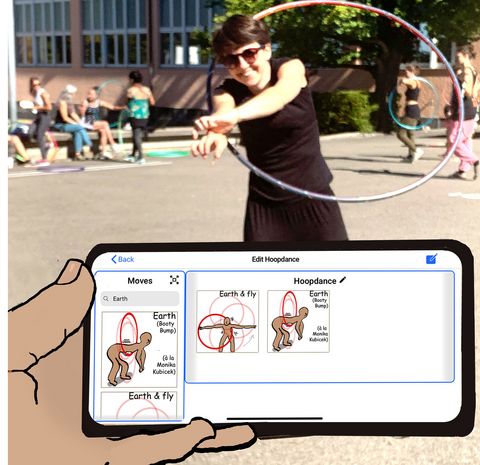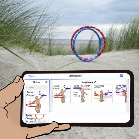 The Hoopdance Designer is made to remember moves and design new Hoopdance Sequences. It’s visual with over 280 images of hoop moves. The author, a Hooper herself, carefully draws each move by hand. The app comes with a powerful search function to find moves. A highlight is the easy-to-use click&drag design interface for designing new Hoopdance sequences. You can customize them by adding text tiles and comments under each hoop move.
