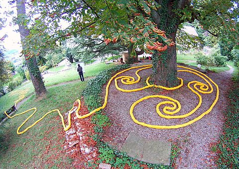 Installation an einer Kunstausstellung: Bei der Villa eines ehemaligen Stoff-Fabrikanten den Faden der Ariadne ausgelegt. Die Villa Favorite ist mit verspielten, geschwungenen Elementen verziert. Die Formsprache dieser Ornamente und Schnörkel wird in die Installation integriert. Gelber Baumwoll-Stoff, Faden, Zeitungspapier, Linden-Holz. Schnörkel-Faden: 120 m, Durchmesser: 7,5 cm / Fadenspule: Höhe 1 m, Durchmesser: 35 cm. Nora Kelemen. 2012. «favorite goes art» war eine Kunstausstellung auf dem Areal der Villa Favorite in Bern, im September 2012. «favorite goes art» www.officegoesart.ch Wer war eigentlich Ariadne?Eine Königstochter in den Sagen der alten Griechen von über 2000 Jahren. Sie verliebt sich unsterblich in Theseus. Theseus steht vor einer schier unlösbaren Aufgabe: Er muss das Monster Minotauros, dass in ein Labyrinth eingesperrt ist, besiegen. Denn wird das Monster besiegt, müssen ihm die Athener auch keine Menschenopfer mehr als Futter bringen. Ariadne gibt Theseus einen Faden mit auf seinem schweren Weg, diesen soll er abwickeln, wenn er ins Labyrinth hinein geht. Auf dem Rückweg zeigt ihm der Faden den sicheren Weg hinaus.